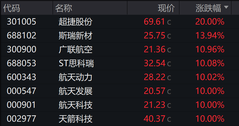 A股商业航天板块延续涨势,航天动力航天发展等涨停,航天机电回封涨停,超捷股份20cm涨停。