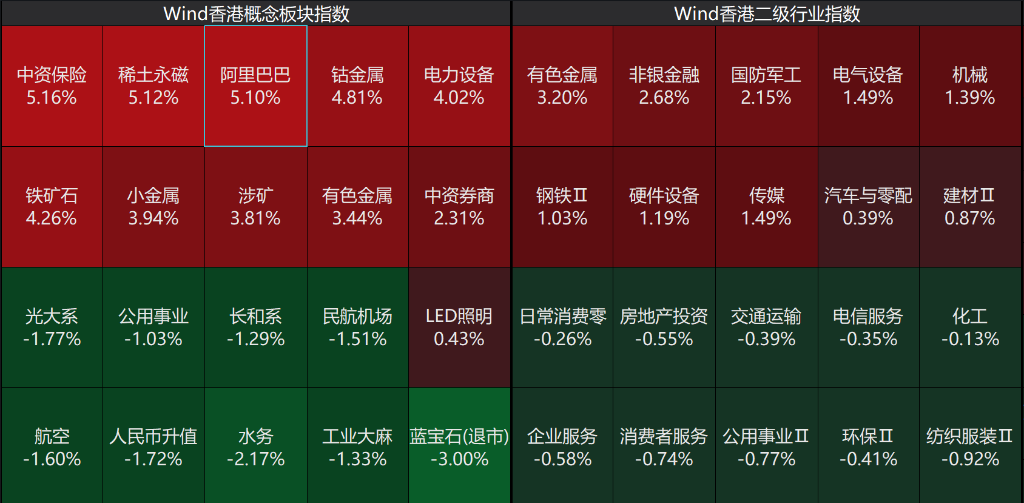板块方面,金融与资源板块携手走强,中资保险、阿里巴巴引领市场,稀土永磁、钴金属、小金属等资源品全线爆发;下跌方面,公用事业、航空、人民币升值受益板块普遍回调,光大系、蓝宝石(退市)等特定概念表现疲弱。