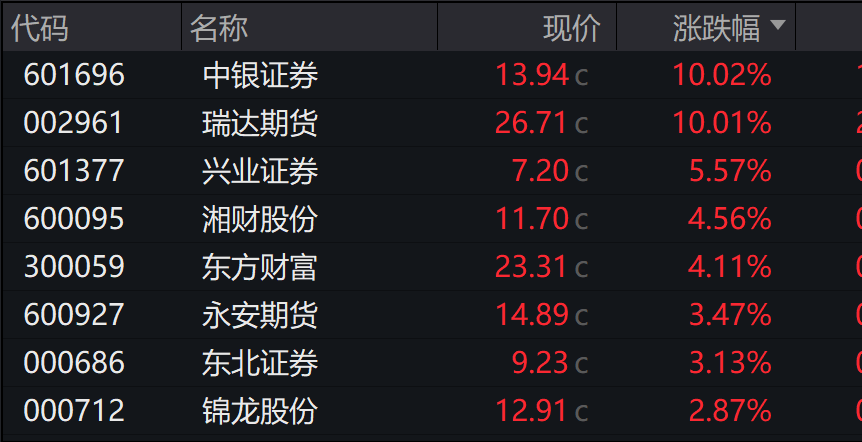 A股券商股持续走强,中银证券瑞达期货涨停,兴业证券涨超7%,湘财股份东方财富东北证券华泰证券跟涨。