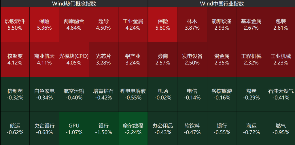 盘面上,个股涨多跌少,今日成交1.74万亿。板块方面,金融科技与前沿科技领涨市场,炒股软件、保险板块强势拉升,两岸融合、超导、核聚变等主题概念集体走强,光模块(CPO)、商业航天等高景气方向表现活跃;下跌方面,银行、GPU、航运等板块普遍调整,航空运输、培育钻石等消费制造板块同步走弱。