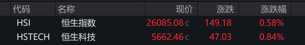 港股低开高走,恒生指数涨0.58%再度站上26000点,恒生科技指数上涨0.84%。午后大部分权重科技股拉升上涨,百度涨超5%,同时大金融股(保险、银行、券商)拉升助力大市上行,铜、铝、黄金等有色金属股继续活跃,新消费概念股、锂电池股、脑机接口概念股、军工股、钢铁股、建材水泥股纷纷上涨。另一方面,航空股、餐饮股、濠赌股、燃气股逆势走低,此外,金额两只新股上市破发,遇见小面上市跌近28%,天域半导体上市跌超30%。