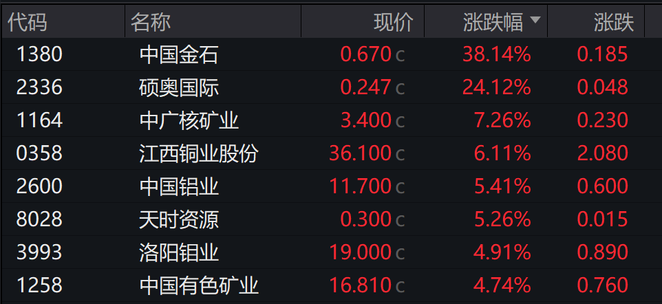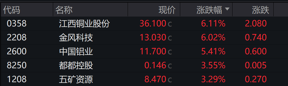 铜、铝、黄金等有色金属股继续活跃,其中,中国铝业江西铜业股份涨超5%。