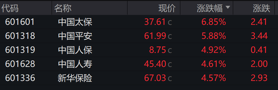 A股保险股拉升,中国太保涨超6%,中国平安涨超5%,中国人保中国人寿等跟涨。