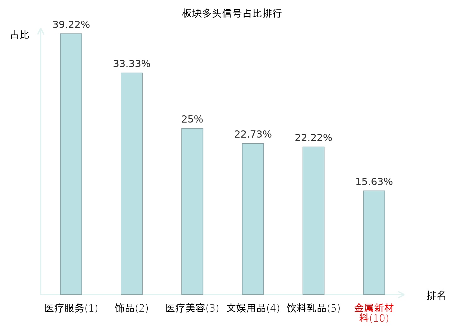 全市场所有行业板块中主力多头信号占比排名中,医疗服务板块位居第一。医疗美容板块名次提升最快,较昨日上升124位。