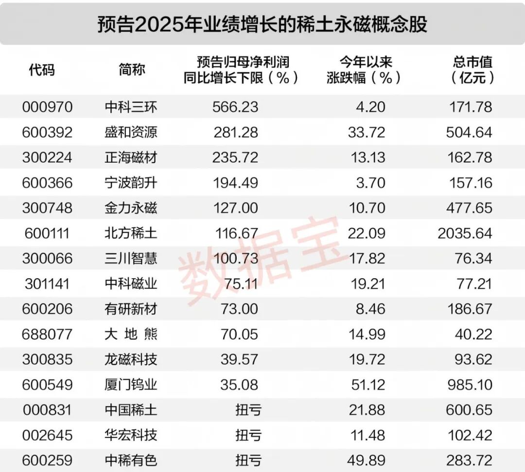 据证券时报·数据宝统计,A股稀土永磁概念股共26只,目前已有16只公布2025年度业绩预告或快报,其中15股实现扭亏或预增,行业盈利能力显著增强。
