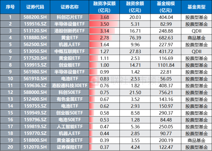 若以近5个交易日行情统计,截至9月30日,共有8只ETF融资净买额超1亿元。其中,科创芯片ETF(588200)、半导体设备ETF(159516)、港股创新药ETF(513120)、黄金ETF(518880)获融资客重点加仓,净买额分别达3.7亿元、3.5亿元、3.1亿元、2.8亿元。机器人ETF(562500)、中概互联网ETF(513050)、黄金股ETF(517520)等融资净买额也居前。