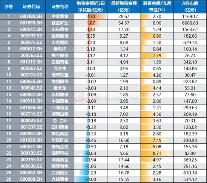 融资余额数据方面,筛选黄金股ETF中的A股两融成分标的,截至9月30日数据,中金黄金紫金矿业山东黄金恒邦股份山金国际获融资客重点加仓,近5日融资净买额分别达2.7亿元、1.7亿元、0.7亿元、0.4亿元、0.3亿元。不过,也有部分黄金概念股遭融资客减持,其中,赤峰黄金江西铜业铜陵有色3股近5日融资净卖额均在1亿元以上。