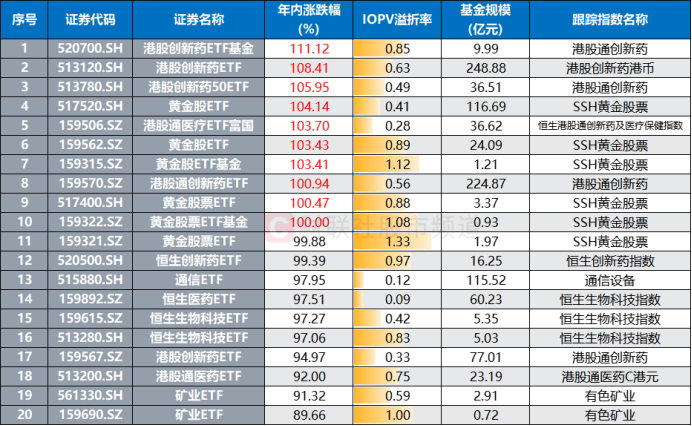 受近期市场继续活跃提振,目前年内涨幅翻倍的ETF基金规模持续扩容,截至今日收盘,共有10只ETF年涨幅在100%以上,较9月初时再度增长3只。在这些“翻倍基”中,5只为今日新晋的黄金股系列ETF,另有5只所属港股创新药概念。其中,跟踪中证港股通创新药指数的港股创新药ETF基金(520700)以111.12%的年内涨幅仍居“涨幅王”宝座。