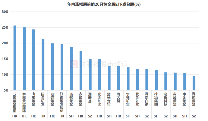 注:年内涨幅居前的20只黄金股ETF成分股(截至10月9日收盘)