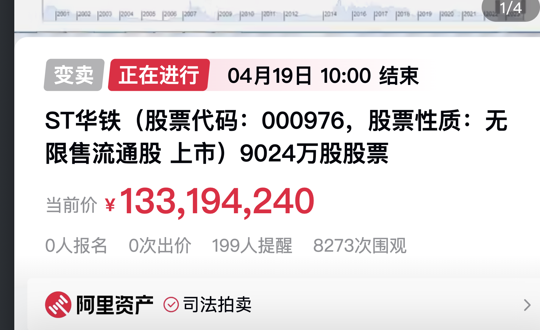 根据阿里资产平台信息,泰通投资持有的ST华铁9024万股股份,从2月19日起开始拍卖,拍卖底价为1.33亿元。截至发稿,该笔拍卖有8000余人围观,但0人报名。