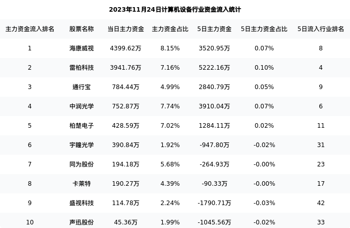 从主力资金流向来看,计算机设备行业今日主力资金流入59.98亿元,在所有申万二级行业中排名:123/131。