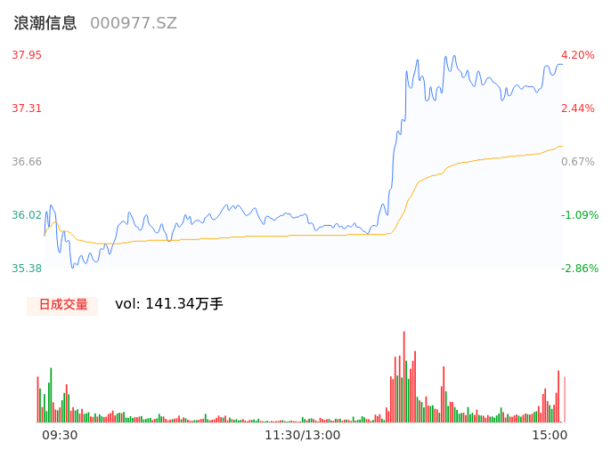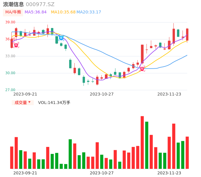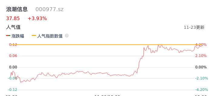11月23日,浪潮信息收报37.85,股价涨幅3.93%,成交金额52.10亿元,换手率9.62%。