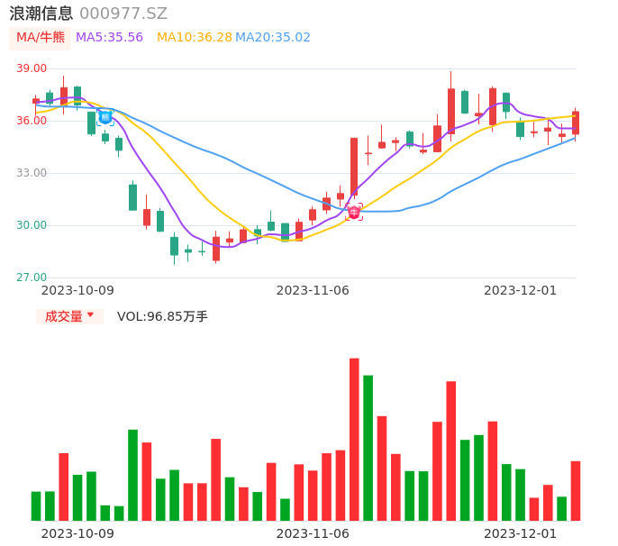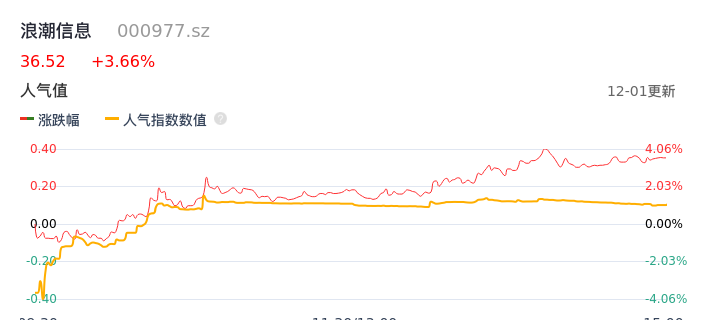 12月01日,浪潮信息收报36.52,股价涨幅3.66%,成交金额34.81亿元,换手率6.59%。