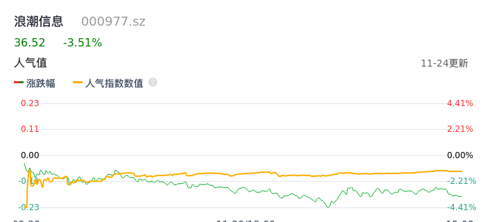 11月24日,浪潮信息收报36.52,股价涨幅-3.51%,成交金额34.51亿元,换手率6.36%。