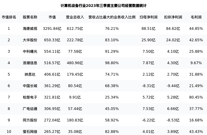 浪潮信息最新报告期数据为三季度,下表汇总了计算机设备行业内市值靠前的公司三季度主要经营数据