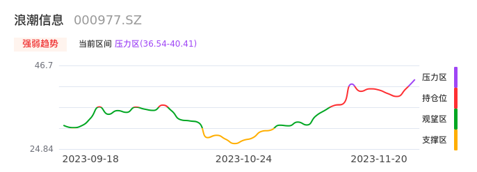 我们来看一下该股的九方特色指标强弱趋势的情况:浪潮信息近日从持仓区进入压力区。股价出现一波快速拉升行情,目前上升动能较为充足可继续持股。注意今日上方压力位:40.41元是否能有效突破。