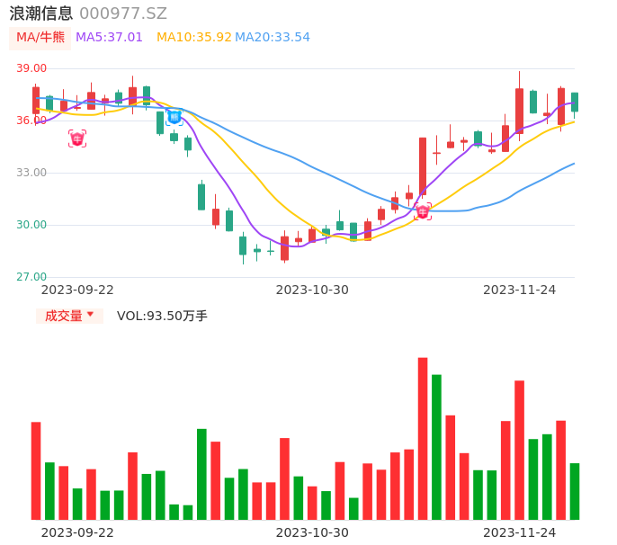 11月24日,浪潮信息收报36.52,股价涨幅-3.51%,成交金额34.51亿元,换手率6.36%。