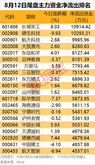 2股尾盘主力资金净流出均超1亿元,分别为长城军工、德生科技。此外,还有航天科技、大族激光、东信和平、豆神教育和万里马等尾盘主力资金净流出居前。