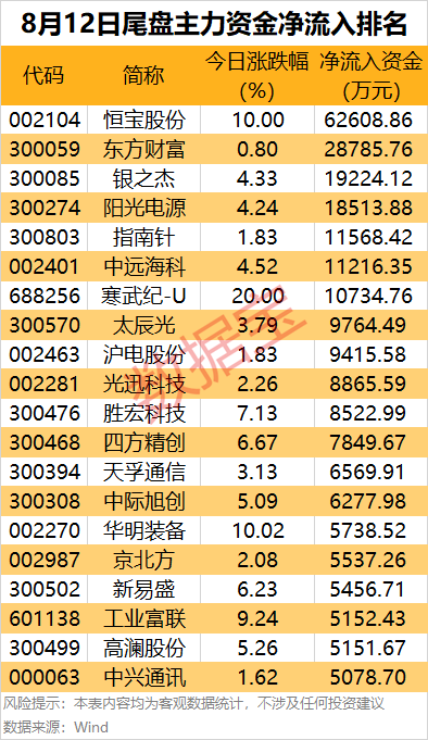 从个股来看,34股尾盘主力资金净流入金额均超3000万元,其中7股尾盘净流入均超1亿元。