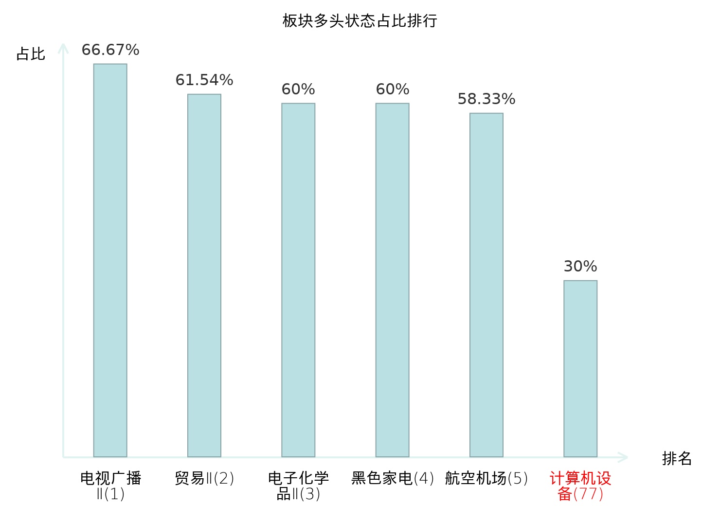 全市场所有行业板块中主力多头状态占比排名中,电视广播Ⅱ板块位居第一。黑色家电板块名次提升最快,较昨日上升80位。