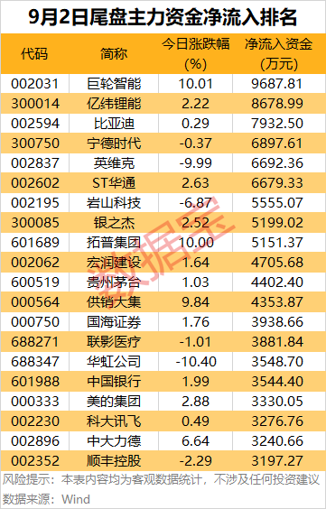 个股方面,巨轮智能、亿纬锂能、比亚迪、宁德时代、英维克、ST华通尾盘获主力资金净流入均超6000万元。