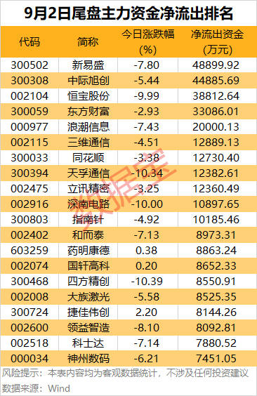 尾盘主力资金净流出方面,11股净流出均超1亿元。新易盛、中际旭创尾盘净流出均超4亿元;恒宝股份、东方财富、浪潮信息尾盘净流出均在2亿元以上。