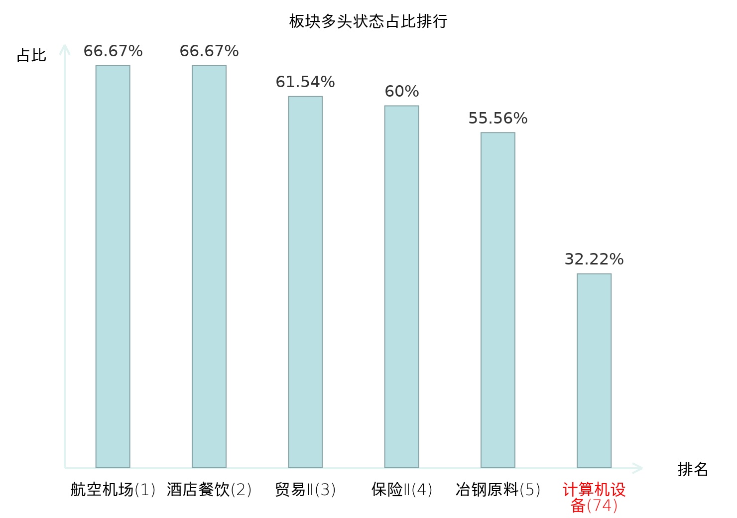 全市场所有行业板块中主力多头状态占比排名中,航空机场板块位居第一。农业综合Ⅱ板块名次提升最快,较昨日上升64位。
