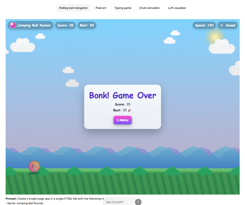 具体而言,GPT-5的编程能力表现亮眼。官方称其为“迄今为止最强大的编码模型”,在复杂的前端生成和大型代码库调试方面表现突出。据称,其通常只需一次提示就能创建网站、应用程序和游戏,并兼具美感。其官网上展示的案例包括:网页游戏、像素画图板、打字计时器、架子鼓模拟器,以及一个音频可视化工具。