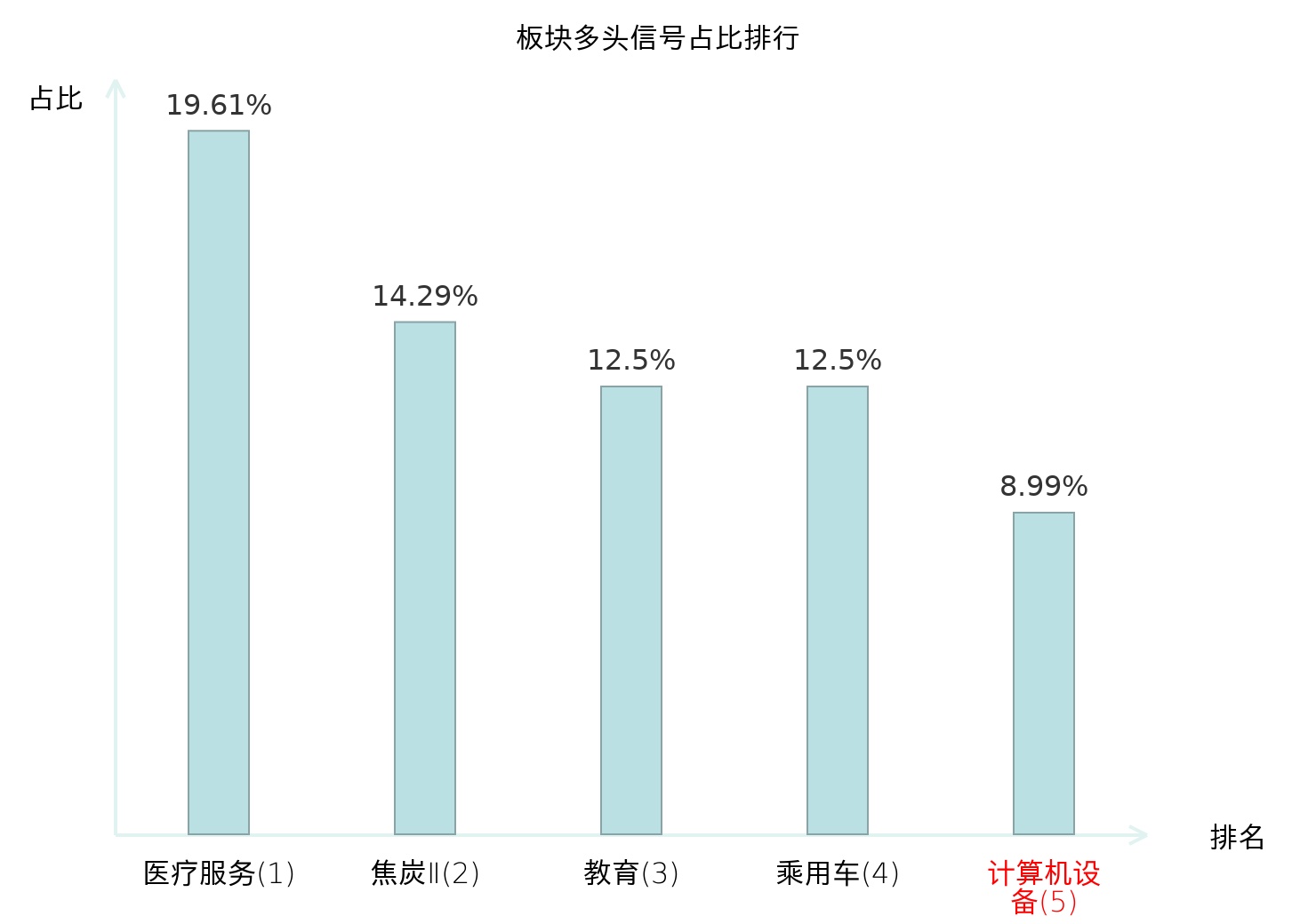 全市场所有行业板块中主力多头信号占比排名中,医疗服务板块位居第一。焦炭Ⅱ板块名次提升最快,较昨日上升119位。