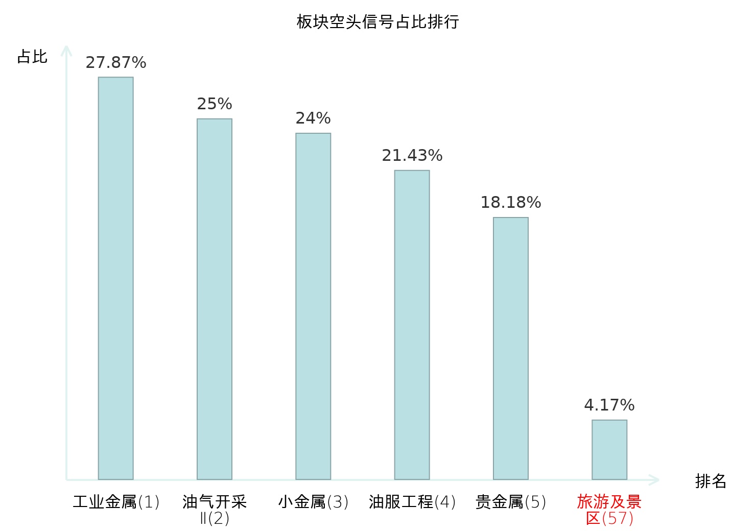 全市场所有行业板块中主力空头信号占比排名中,工业金属板块位居第一。饲料板块名次提升最快,较昨日上升112位。
