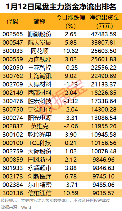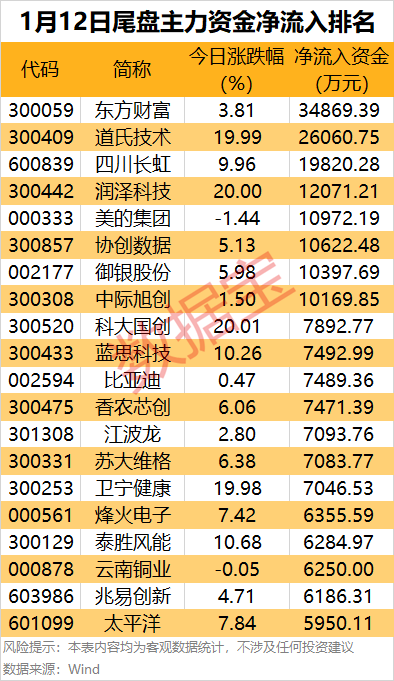 还有四川长虹、润泽科技、美的集团和协创数据等尾盘主力资金净流入金额居前。