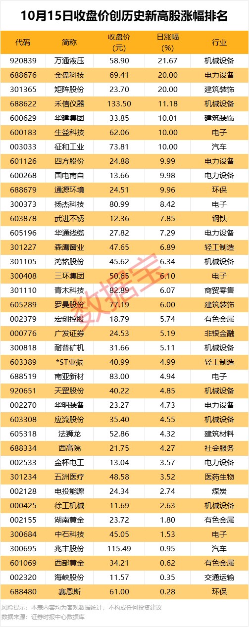 收盘价创历史新高股中,今日股价平均上涨6.70%,涨停的有金盘科技矩阵股份华建集团等,涨幅居前的有万通液压禾信仪器通源环境等。