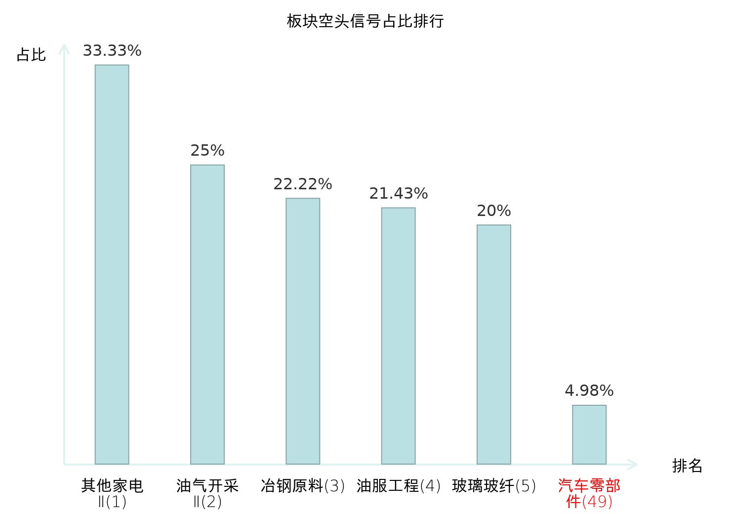 从主力宝信号数据分析,山子高科所属的汽车零部件板块中共13只股票发出主力空头信号,主力空头信号占比在全行业中排名第49位,较昨日上升5位;排名越高说明主力当日卖出意愿越强;全市场所有行业板块中主力空头信号占比排名中,其他家电Ⅱ板块位居第一;铁路公路板块名次提升最快,较昨日上升113位。该排名变化表明主力对汽车零部件板块的看空倾向有所增强,而其他家电Ⅱ板块的主力空头信号集中度最高,铁路公路板块则呈现主力空头信号占比加速上升态势,上述变动为投资者评估不同行业板块内主力态度分化及潜在风险提供了客观依据。