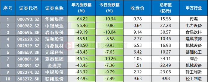 此外,在上述这些个股中,累计共有31股年内股价已失三成以上。其中,华闻集团、中银绒业2只个股的股价遭“腰斩”,分别下跌近64.2%、56.5%,岩石股份、瑞和股份、海源复材、元琛科技、亚泰集团等股今年以来也跌幅居前。值得注意的是,传媒股华闻集团、电力设备股中银绒业目前已多日不足1元,同时,综合股亚泰集团股价也已逼近“1元红线”。