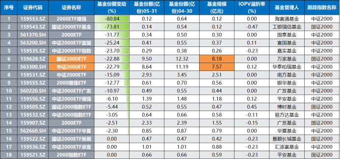 目前,小微盘股持续陷入调整,相关ETF份额也不断下降。截至5月31日数据,筛选跟踪中证2000、国证2000指数的相关ETF,基金规模最大的国证2000ETF(万家基金)、中证2000ETF(华泰柏瑞基金)近1个月基金份额分别减少近22.9%、22.8%。此外,其余ETF中,海富通基金2000ETF增强、工银瑞信基金国证2000ETF的近1月的基金份额降幅居前。