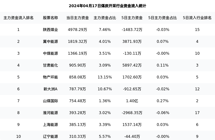 从主力资金流向来看,煤炭开采行业今日主力资金流入30.63亿元,在所有申万二级行业中排名:71/131。