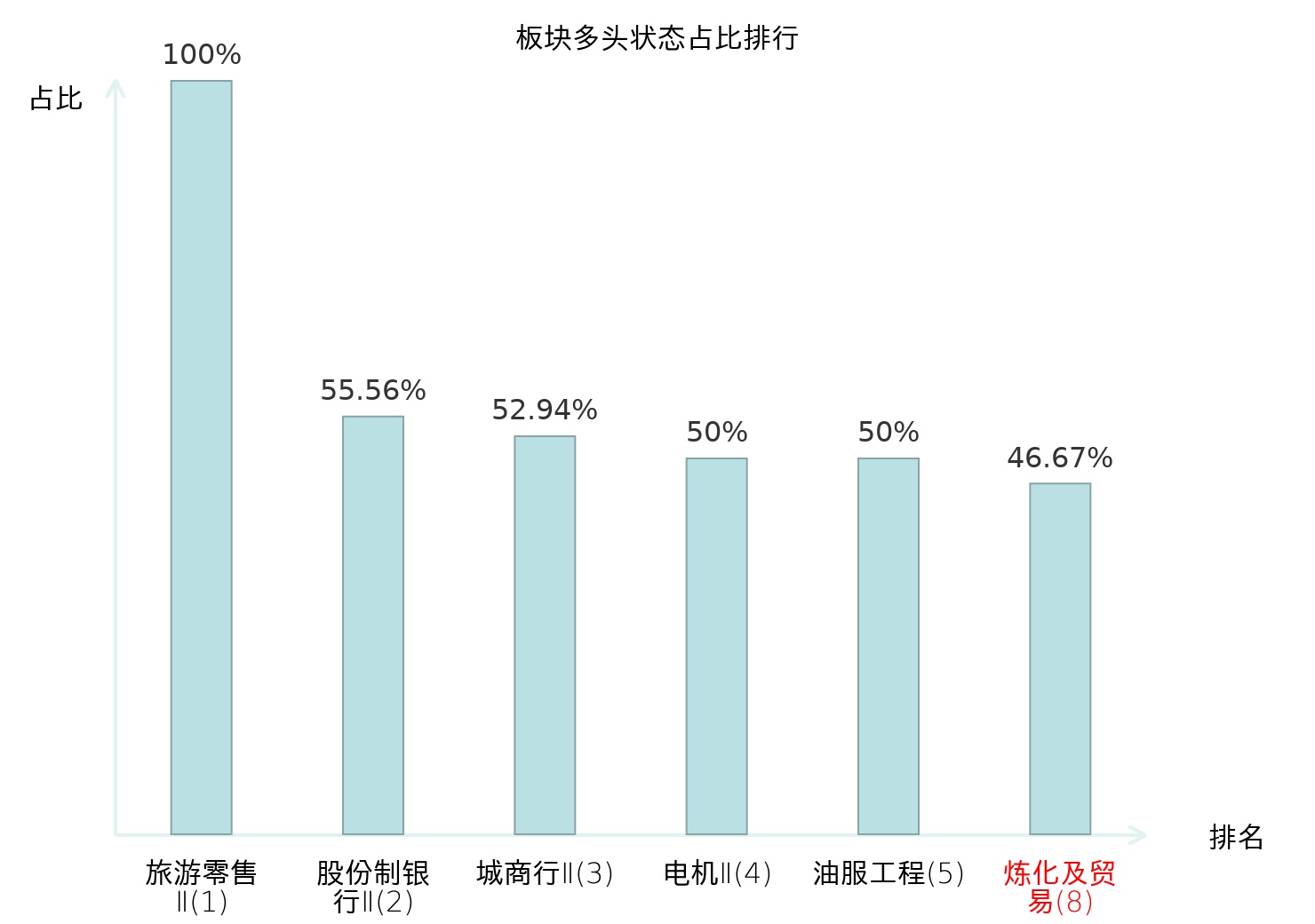 全市场所有行业板块中主力多头状态占比排名中,旅游零售Ⅱ板块位居第一。互联网电商板块名次提升最快,较昨日上升65位。