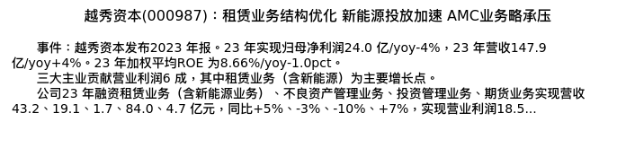 值得注意的是:2024年04月方正证券的许旖珊分析师,首次发布关于越秀资本的研究报告,标题为:越秀资本(000987):租赁业务结构优化 新能源投放加速 AMC业务略承压。
