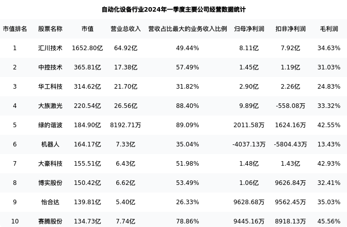 华工科技最新报告期数据为一季度,下表汇总了自动化设备行业内市值靠前的公司一季度主要经营数据