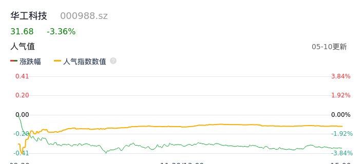 05月10日,华工科技收报31.68,股价涨幅-3.36%,成交金额10.77亿元,换手率3.36%。