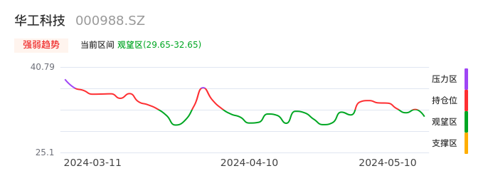我们来看一下该股的九方特色指标强弱趋势的情况:华工科技近日从持仓区下穿到观望区,股价出现持续性调整行情。短期已经转为空头行情,且下跌动能仍未衰竭。建议继续谨慎观望。