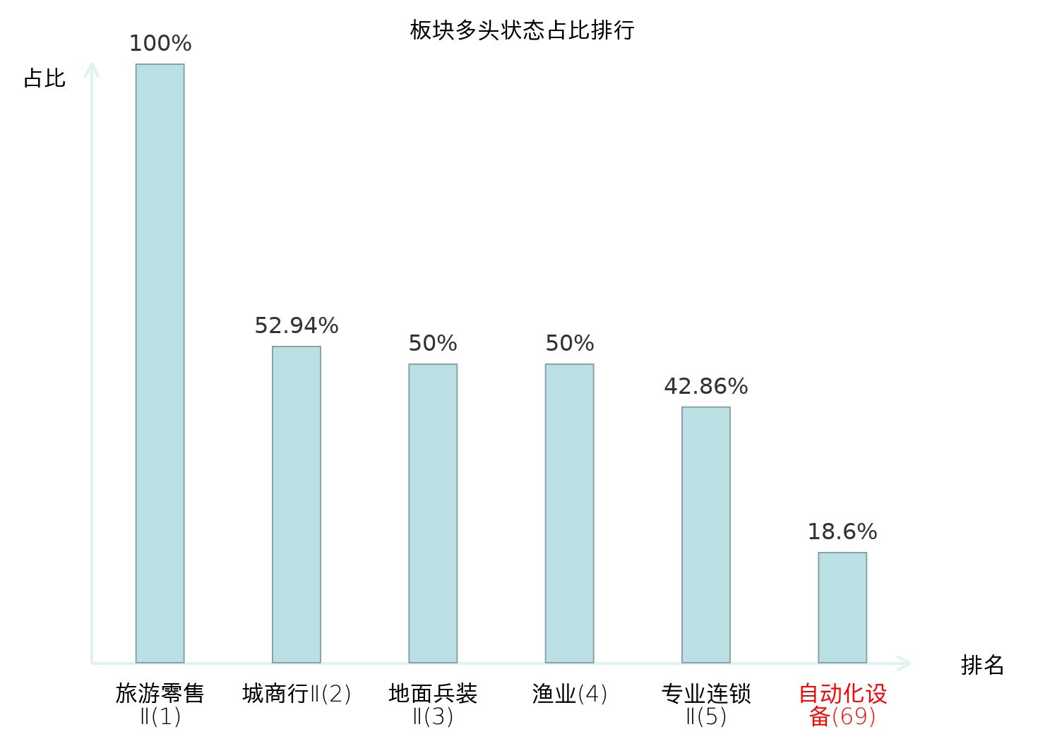 全市场所有行业板块中主力多头状态占比排名中,旅游零售Ⅱ板块位居第一。旅游及景区板块名次提升最快,较昨日上升69位。