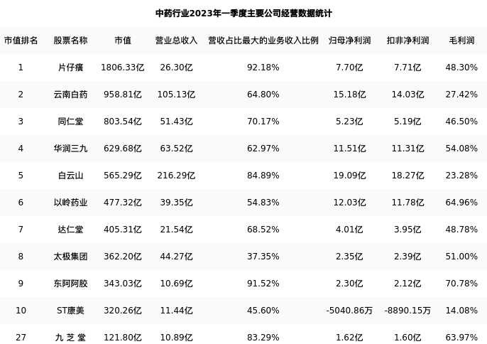 九芝堂最新报告期数据为一季度,下表汇总了中药行业内市值靠前的公司一季度主要经营数据