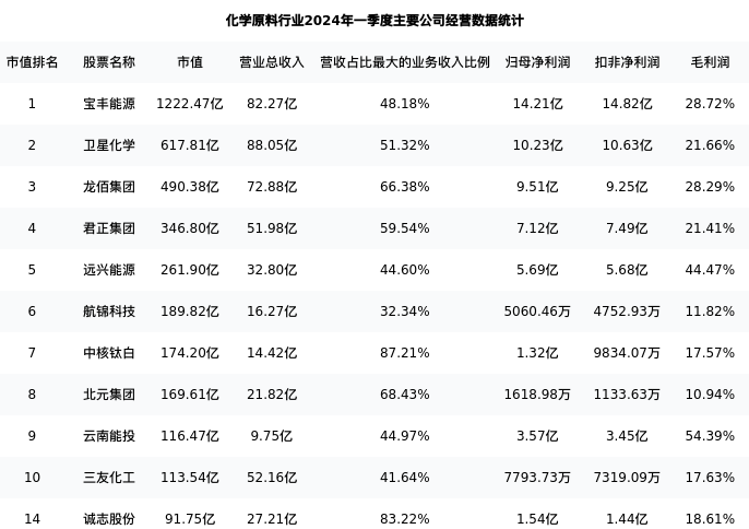 诚志股份最新报告期数据为一季度,下表汇总了化学原料行业内市值靠前的公司一季度主要经营数据