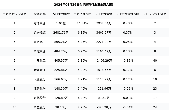 从主力资金流向来看,化学原料行业今日主力资金流入23.81亿元,在所有申万二级行业中排名:79/131。