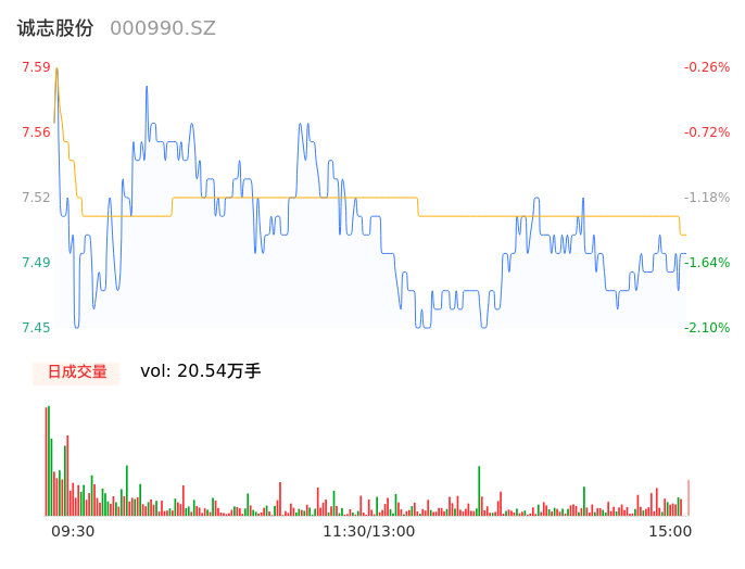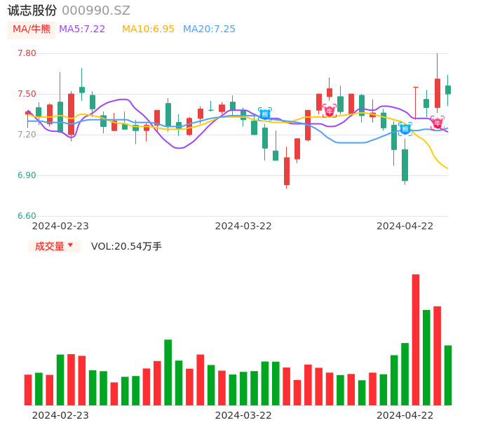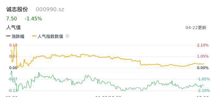 04月22日,诚志股份收报7.50,股价涨幅-1.45%,成交金额1.54亿元,换手率1.69%。