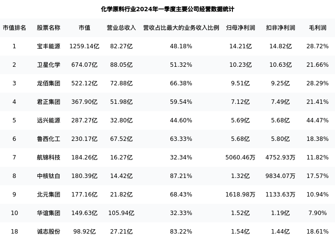 诚志股份最新报告期数据为一季度,下表汇总了化学原料行业内市值靠前的公司一季度主要经营数据