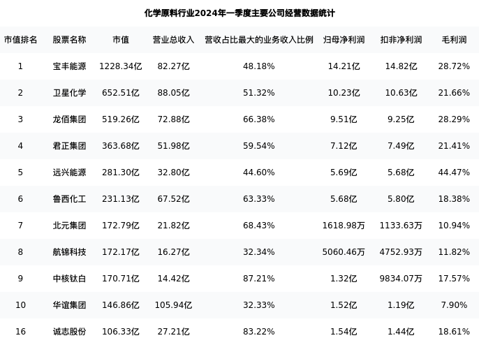 诚志股份最新报告期数据为一季度,下表汇总了化学原料行业内市值靠前的公司一季度主要经营数据