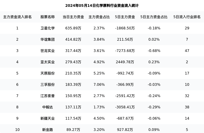 从主力资金流向来看,化学原料行业今日主力资金流入15.76亿元,在所有申万二级行业中排名:101/131。