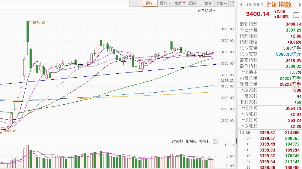 大盘分析及后市展望:今日大盘围绕3400点多空拉锯,银行、煤炭等红利资产继续回调,AI硬件等科技热点也都回调,盘面仅剩下近期未有任何表现的农业股、军工股活跃;无明显热点和人气,好在盘中券商发力,将指数推了一把,才让收盘在3400点之上,没有足够的做多动能,可能还是各路资金都在观望这关键点位后大盘方向如何选择;技术指标看,已连续站稳各均线之上4日有余,后市谨慎偏乐观,指数大概率稳中向上,选股变得尤为重要。